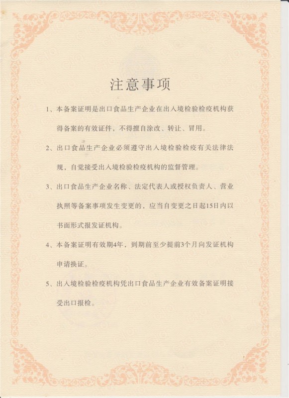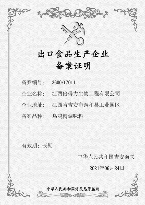 倍得力出口食品备案证书