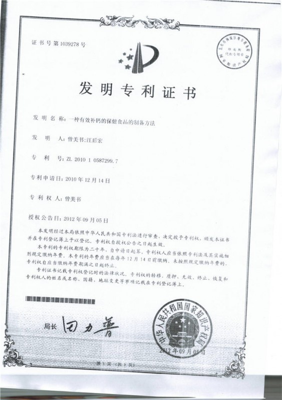 钙专利认证教授签字
